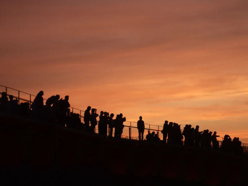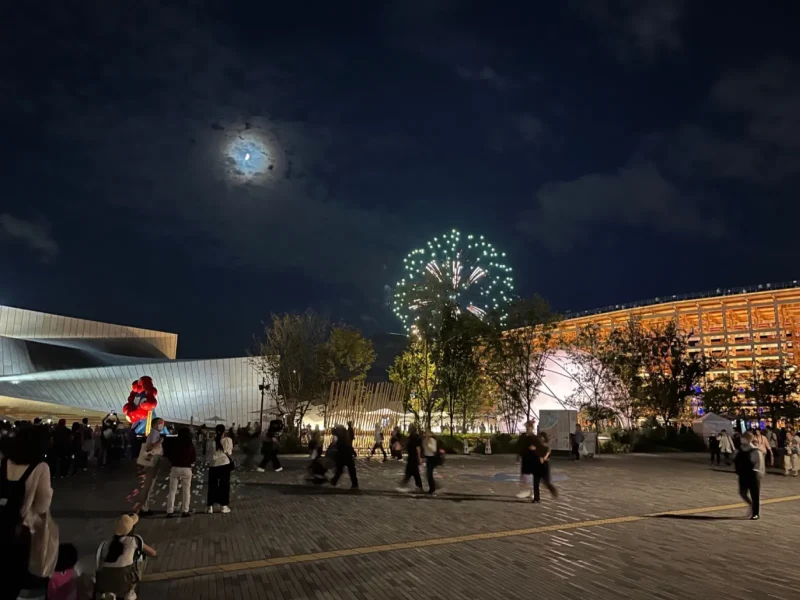 本稿の締めくくりにあたり、1枚の写真をお見せしたいとおもいます。秋の夕暮れどき、6時35分から5分間の花火大会があり、上空には上弦の月が輝いていました。しかも虹の輪、いわゆる月暈(つきがさ)がかかっていました。地上では大人気のミャクミャクがライトアップされ、夜の来場者をむかえています。この取り合わせをたのしんで、その日は万博をあとにしました。東ゲートと地下鉄駅に向かう人ごみにまじって。