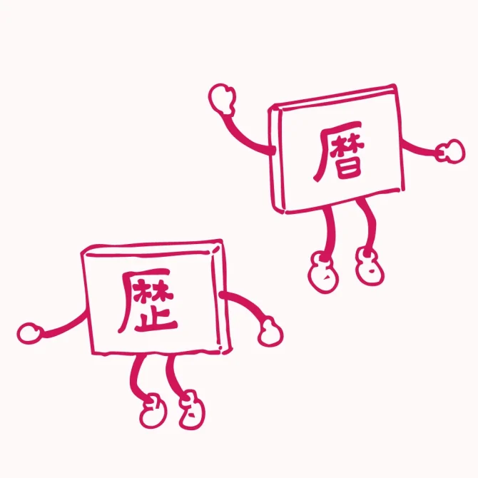 漢字の「暦」と「歴」はともに「れき」と読み、厂(がんだれ)と林(ならべる)を共通にしていますが、本来は木ではなく禾(のぎ)、すなわち厤でした。これは建物のなかに穀物を貯蔵している状態をあらわしています。そこに「日」をくわえたのが暦であり、「止(足)」をつけたのが歴です。つまり、穀類の貯蔵日を記録したのが暦であり、その歩みをしめしたのが歴となります。