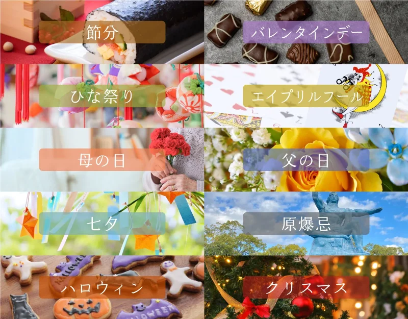 私たちの暮らしに身近な10の行事、「節分」「バレンタインデー」「ひな祭り」「エイプリルフール」「母の日」「父の日」「七夕」「原爆忌」「ハロウィン」「クリスマス」のうちいずれかを季語として用いた俳句を募集します(傍題可)。