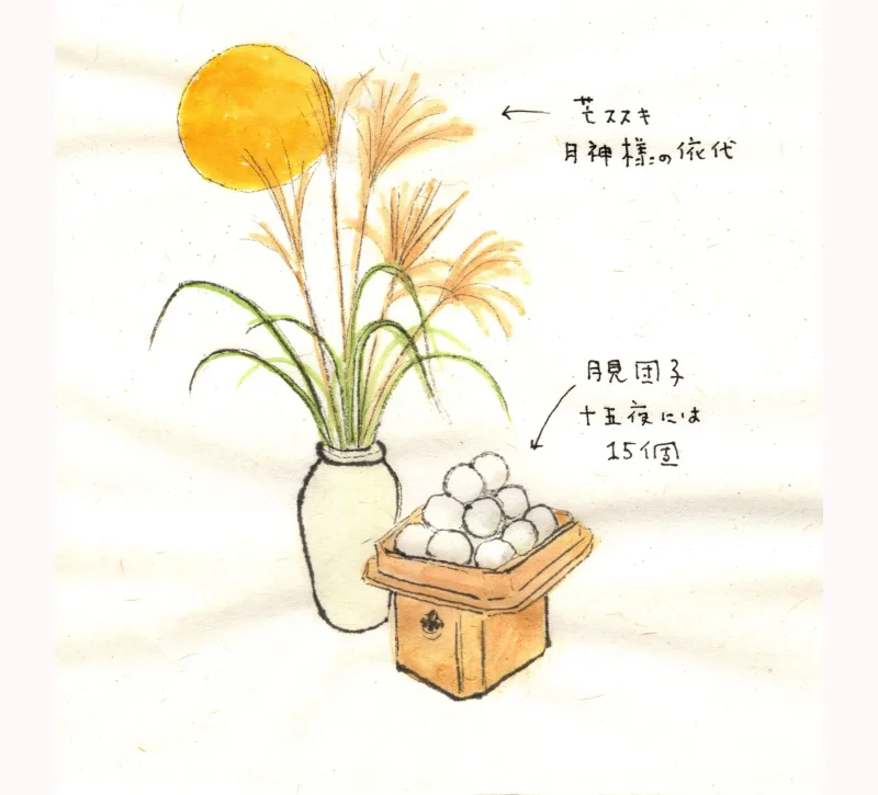 お月見のお供えといえば、月見団子に芒ですね。十五夜には15個のお団子、十三夜には13個のお団子をお供えします。また、お団子ではなく、お餅を搗いて丸くした鏡餅をお供えする地域や、お赤飯をお供えするところもあるそう。お団子もお餅も、新米をつかうことが重要です。
