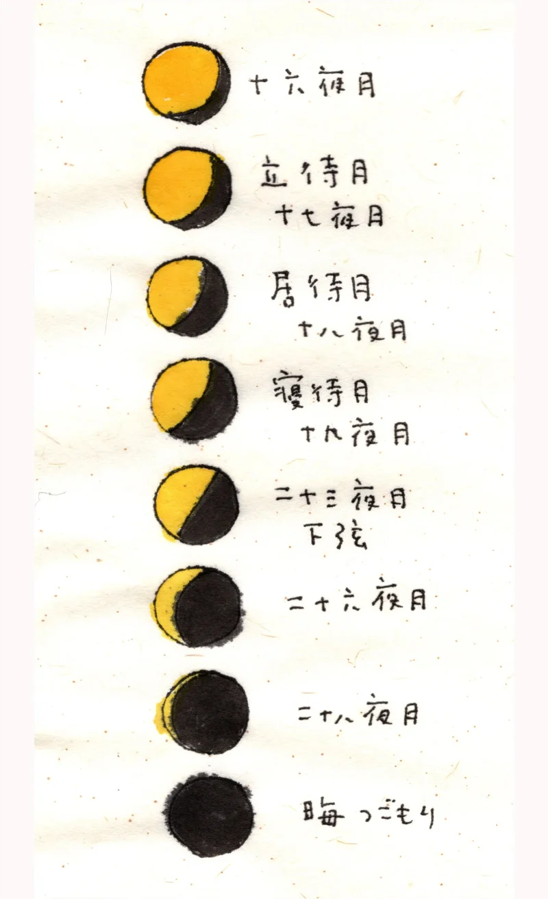 それぞれの月に名前がついているのも面白い。満月の翌日の月は「十六夜」。いざようとは、「ぐずぐずする」という意味で、「早く出てこい~!」というところでしょうか。