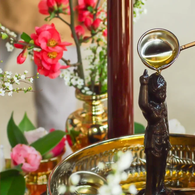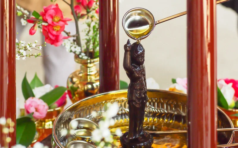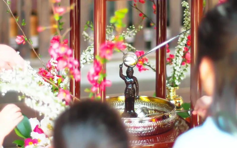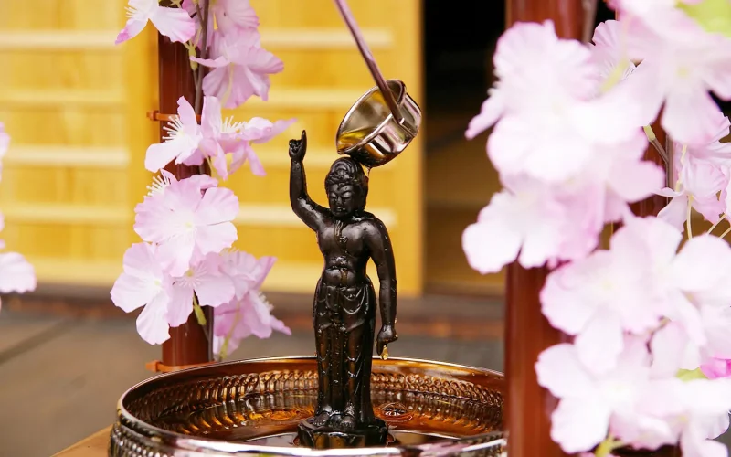 花祭りとは、お釈迦さまの誕生日を祝う仏教行事です。当日は日本各所の寺院で、たくさんのお花を飾った「花御堂(はなみどう)」が用意され、参拝者は花御堂の中心に安置されたお釈迦さまの像に柄杓で甘茶をかけてお祝いします。