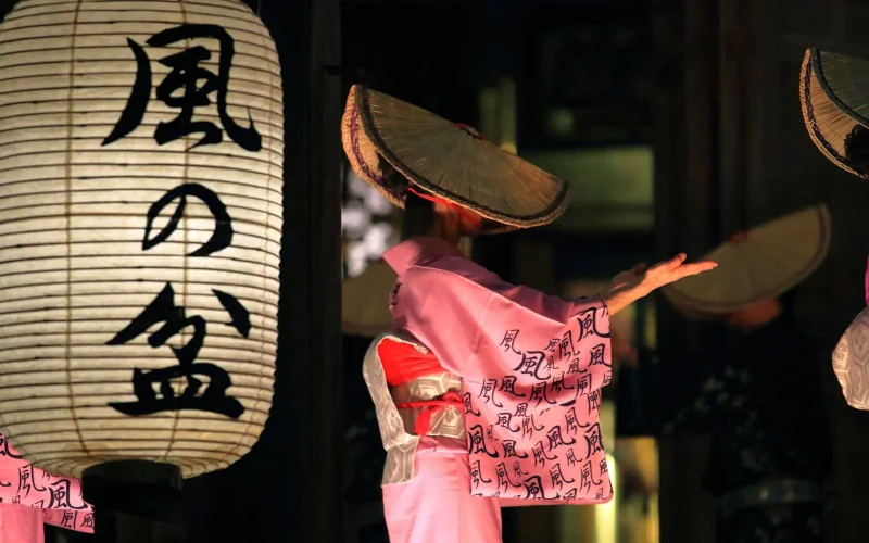 哀愁を帯びた胡弓の音を主旋律に、静かに進む踊りの列──ぼんぼりだけが灯る町は幻想的で、夏と秋のはざまに広がる異界の入り口のようです。虫の音がすっぽりと町を包み、祖霊を慰める祈りと、収穫の無事を願う心が静かに重なってゆきます。
