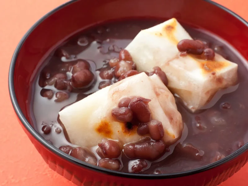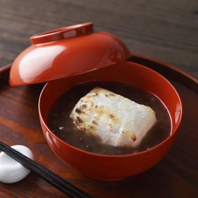 お下がりの鏡餅は、小豆といっしょにお汁粉やぜんざいにしていただくのが一般的です。小豆の赤い色には邪気を払う力があると信じられ、古くから行事食や祝いの席に欠かせない食材とされてきました。そのほか、揚げ餅にしたり、焼いて砂糖醤油で食べたりする家庭もあります。