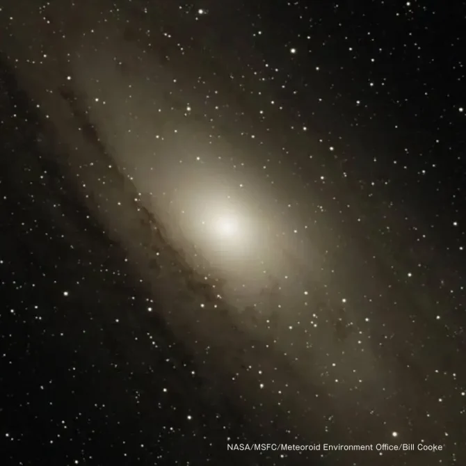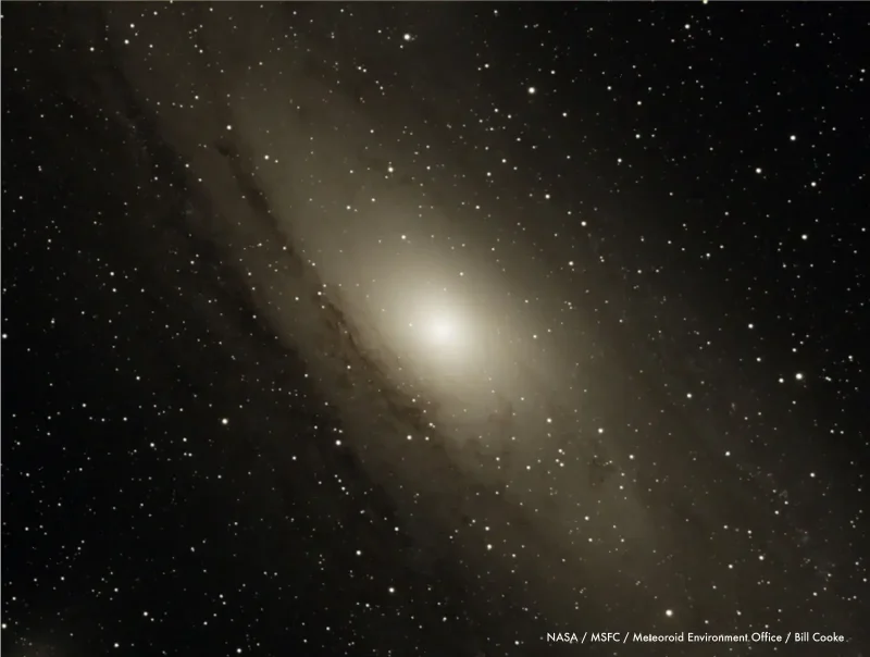 銀河は、星の大集団。宇宙空間には無数の銀河が存在しています。その中でもアンドロメダ銀河は私たちが住む地球から俯瞰して見ることが出来る最も近い銀河です。郊外の星が良く見えるところはもちろん、街中でも双眼鏡を使えば見ることができます。アンドロメダ銀河の見た目の大きさは、満月を横に5~6個並べたときと同じくらい。とても大きく見える天体のため、高い倍率の天体望遠鏡で見るよりも肉眼や低倍率の双眼鏡で観察するほうが、銀河らしい形が分かって面白いです。