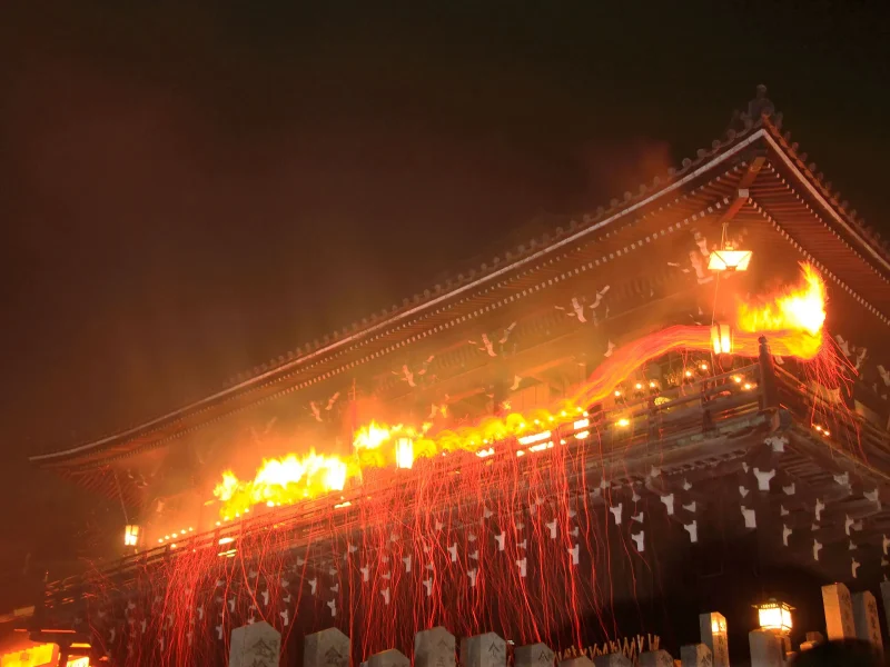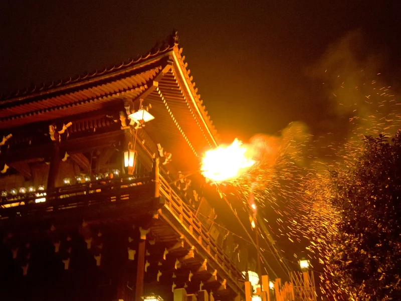12日の行事のしめくくりは、「達陀(だったん)」という儀式です。この儀式では、重さが約8キロもある大きな松明(たいまつ)が、内陣(ないじん:本尊の近くの場所)を激しく動き回ります。炎が滝のように落ちる光景は圧巻です。