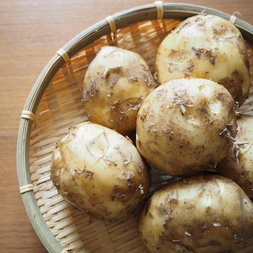 新じゃがいもは秋からのじゃがいもと比べ、葉や茎がまだ青い状態の時に収穫し保存されるので、小ぶりで鮮やかな色をしています。皮が柔らかく、水々しいのが特徴です。