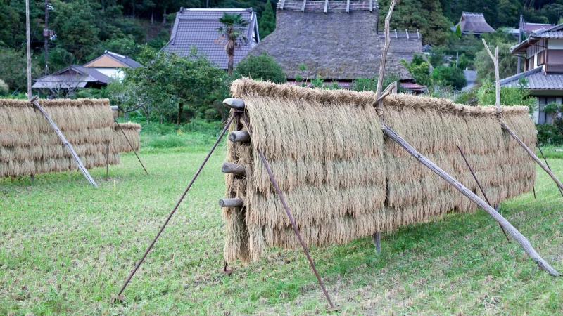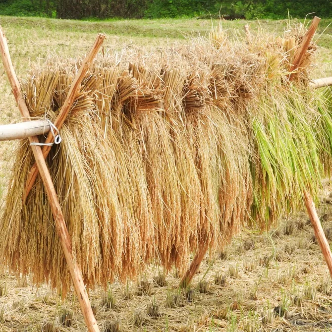 稲は刈り入れが終わると束ねて稲木にかけ、天日干しにします。先日京都でその光景を見ましたが、少し暗くなり始めた時間帯も相まって、厳かで神秘的な雰囲気を感じました。