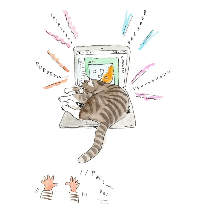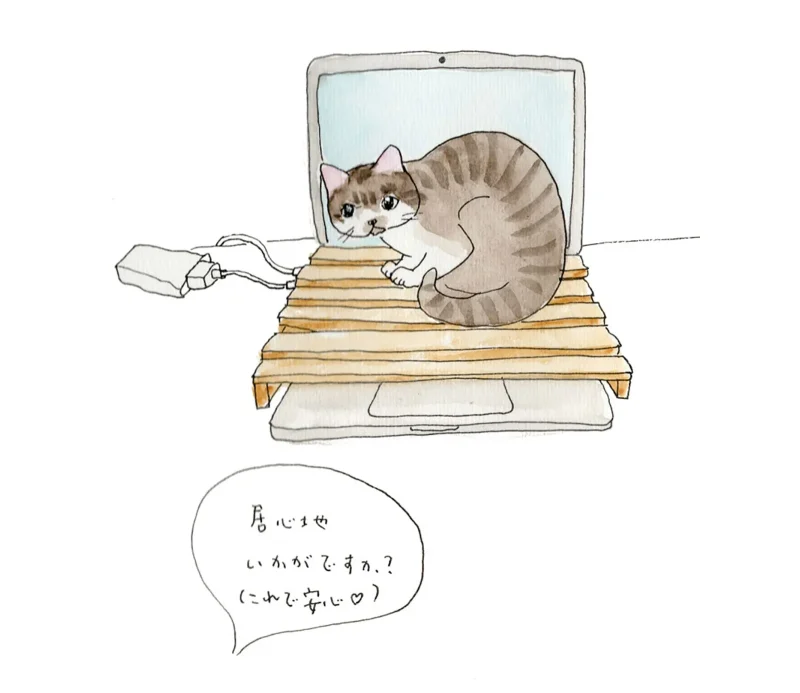 実害がなければいくらでもキーボードの上でくつろいでいただいてもいいのですが、電源が入っている状態で乗られると非常に困ります。とんでもないキーを押されてファイルがどこか奥深いところへしまわれてしまったり、ファイルの名前がまるで違う名前になっていたり。原稿のデータを消されたことも一度や二度ではありません。