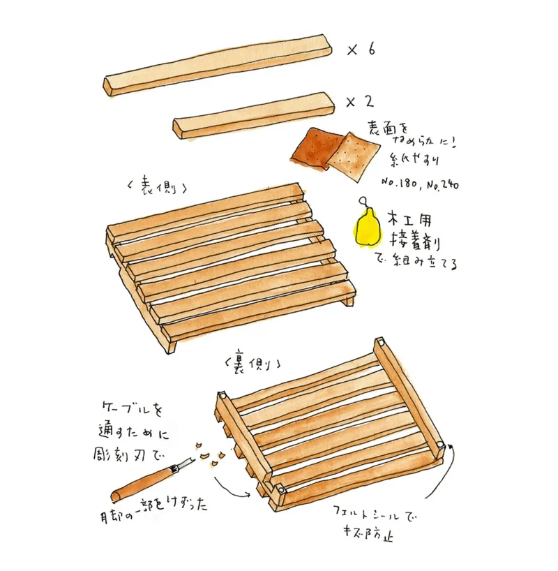 ともあれ材料が揃った。で、まずは甲斐甲斐しく紙やすりで材の表面を滑らかに仕上げます。最初は中目、次に細めの紙やすりですっかりスベスベ。材の角もそこはかとなく取れて、手ざわり極上です。