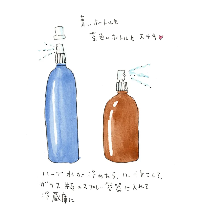 冷めたら冷蔵庫に入れて一晩。翌日から使い始めます。ハーブを茶漉しなどでこしてから、ガラス瓶のスプレー容器に移します。いちおう遮光の青や茶色のボトルを使って気分を出していますが、使わないときは冷蔵庫に入れておくので、そんなに気にしなくても良さそうです。透明のボトルでもかまわないでしょう。