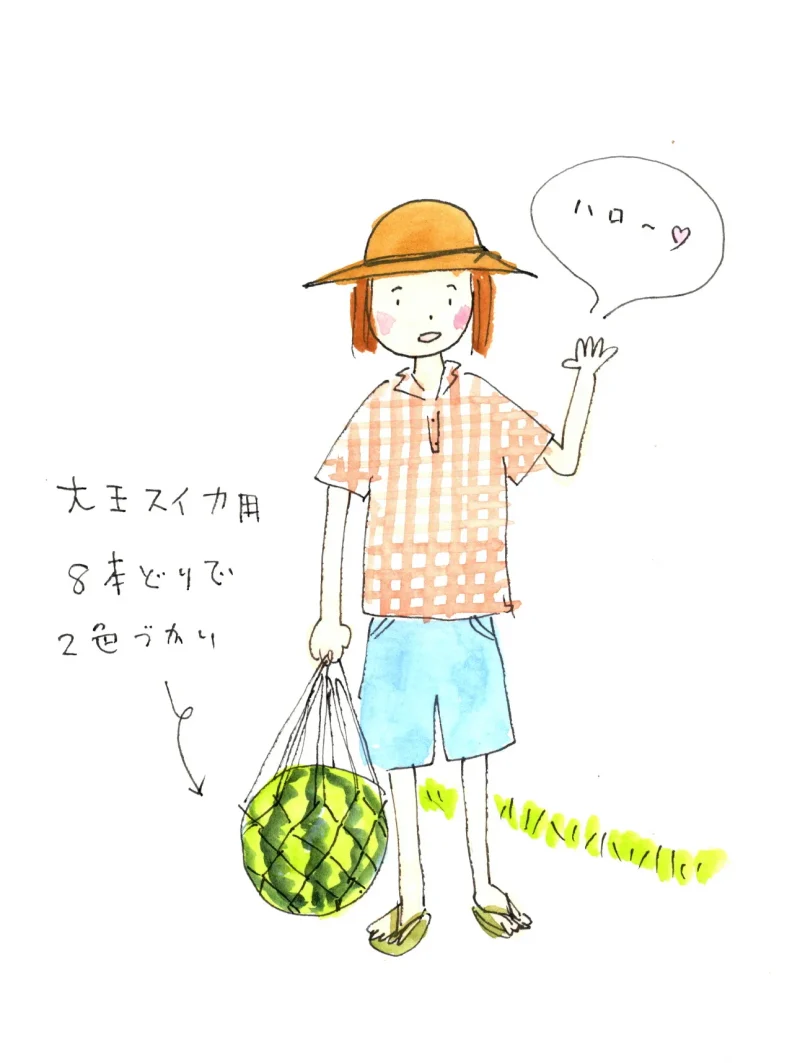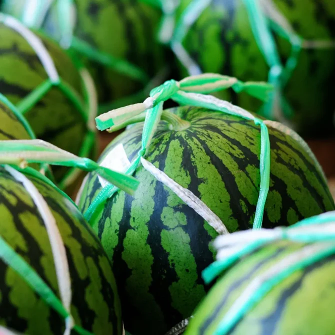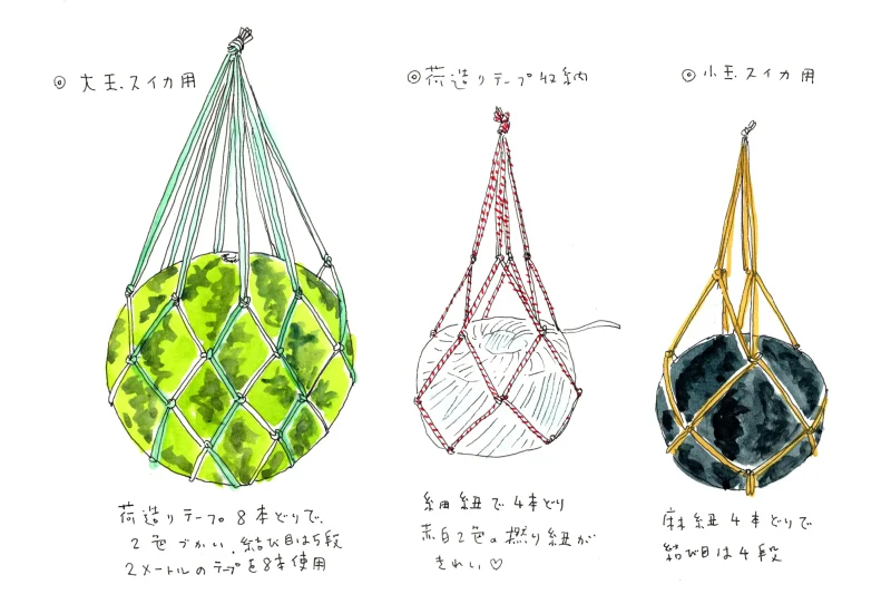 ナイロンの荷造りテープは2色の紐を使って涼しげに。小玉スイカなら、麻紐を使うのも味わい深い。順番に隣同士の紐を結んでいくだけなので、単純な作業です。大玉用は紐も多いので30分くらい、小玉用なら15分もかからずに出来上がります。