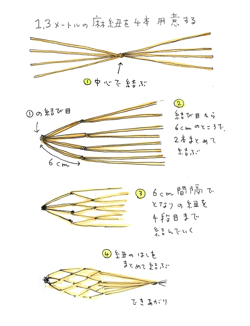 この網を作り始めると面白くって止まらなくなって、何かほかに入れるものはないだろうかと部屋中をキョロキョロ。そうだ、今まさに使っている荷造りテープを入れるのにも便利ではないか。赤白2色の撚り紐を使って作ったら、白い荷造りテープに映えてゴキゲン。こうなったら本物のサッカーボールを買ってきて、自作の網に入れたい気分にさえなりました。メロンやカボチャも手製の網に入れてプレゼントしたら、よろこんでもらえるそう。ほかにも、網に入れるとよさそなものを考えながら、この手提げ網を作ってみてくださいませ。