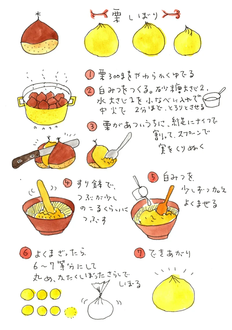 茹でた栗の実をくり抜いて少しすり鉢で当たって、そこに白みつを混ぜ、茶巾絞りにして出来上がり。茹で栗を剥きながら食べるのはなによりの秋のごちそうですが、ちょっと趣をかえて、小さな茶巾しぼりに仕上げるとまたいいものです。黒文字など添えて、お客様にお出しするのも素敵。