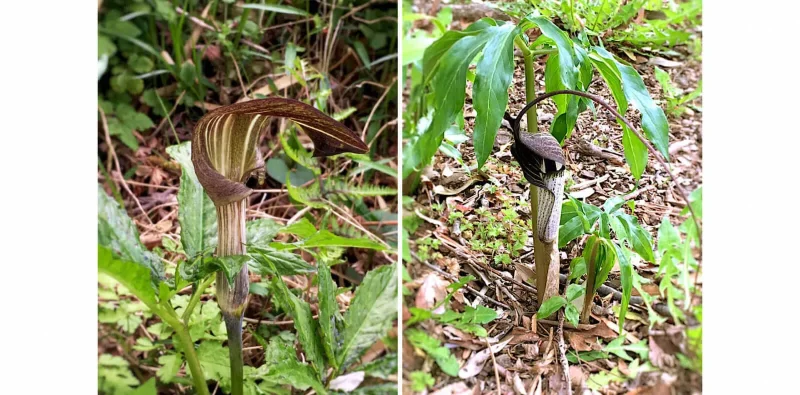 マムシグサは茎のまだら模様がマムシを思わせることからこの名があり、ウラシマソウ(浦島草)は浦島太郎の釣り糸のような長いヒゲがあります。