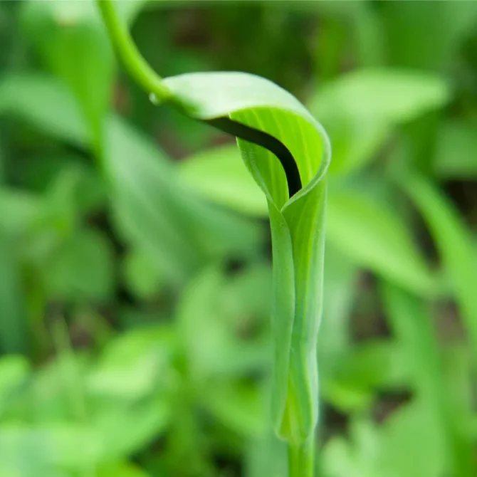 初夏の森で、こんなドキッとするような不気味な植物の姿を目にしたことはないでしょうか。紫や黒の仏炎苞(ぶつえんほう)をもつマムシグサ、ムサシアブミ、ウラシマソウなど、サトイモ科のテンナンショウ属です。