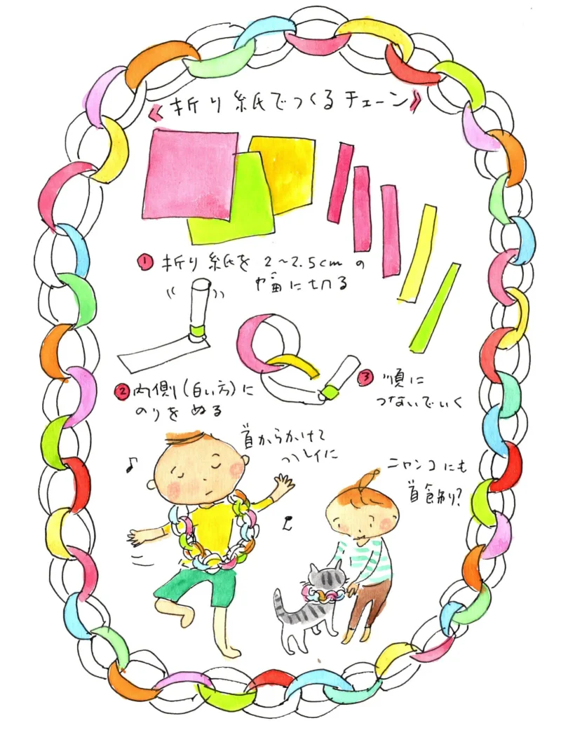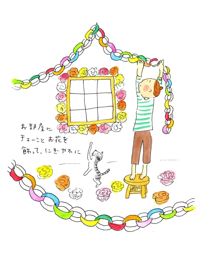 引き出しに仕舞いっぱなしになっていた折り紙を引っ張り出してきて、まずは色紙チェーンをつくります。折り紙を細く切って、のりづけした輪っかをつなげていく、というごく単純な作業。音楽など聴きながらのんびりやっていると、けっこう長くでき上がっていて面白いほどです。