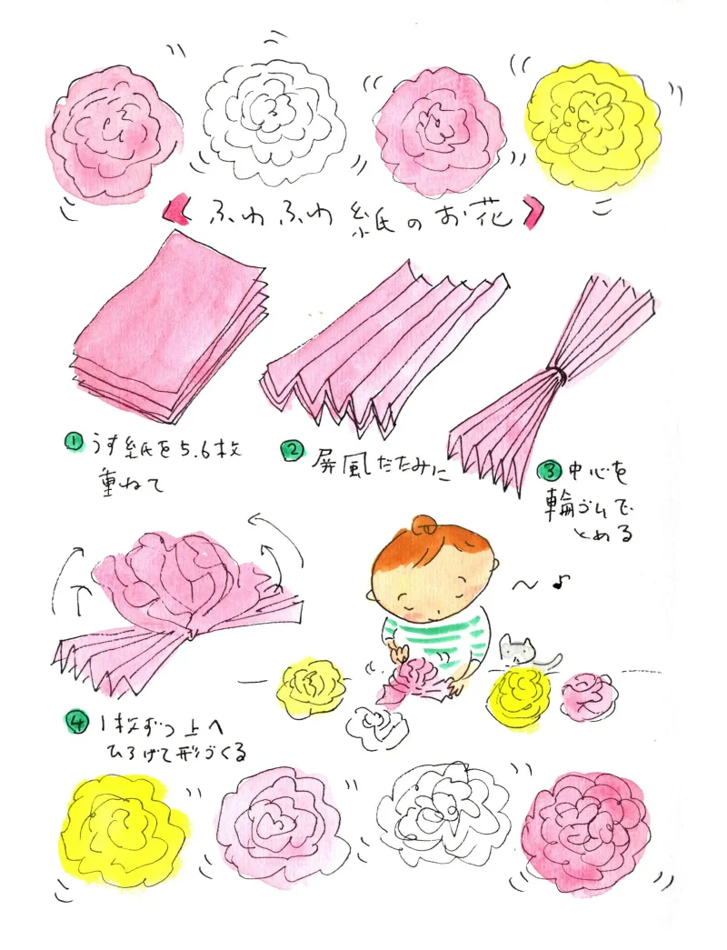 学校の催しでは、クラスのみんなで教室の飾り付けをして、それも楽しみのひとつでした。折り紙で色とりどりのチェーンをつくったり、薄紙でフワフワの大きなお花をつくったり。これを今また、リバイバルでつくってみます。