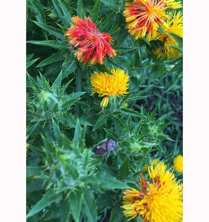 一度だけ紅花の収穫を手伝わせてもらったことがありますが、ゴムの手袋をしても痛いほど花のつけ根に鋭い棘があり、これを素手で摘まなければなからなかった人々はどんなに苦労したことか、と驚きました。花摘みは棘がやわらかくなっている早朝に行われたそうです。一体、どれだけ摘まれたくないのか、と思うほど頑丈で、鋭い棘です。
