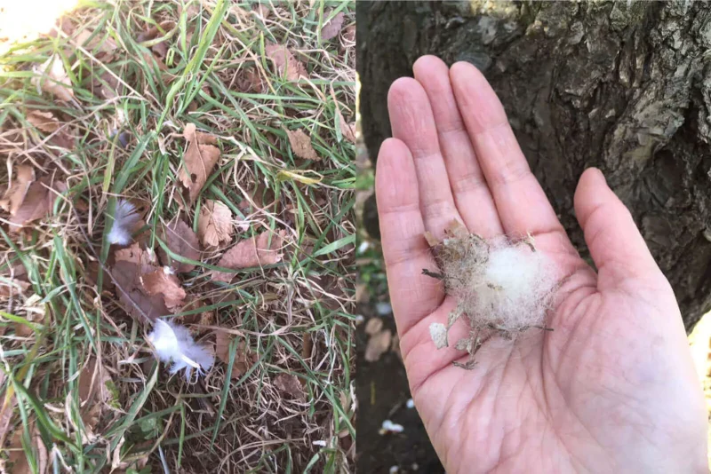 この森の下を歩くとオオタカが食べた鳥の羽毛がたくさん落ちています。エナガは猛禽類が食べた中型の鳥の羽毛を集めて、春のまだ寒いうちに保温性の高い巣を作ります。