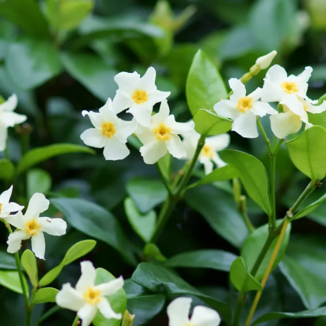 さて、この季節に咲く香りのいい花は、ジャスミン、スイカズラ、ニオイバンマツリなどいくつもありますが、テイカカズラもそのひとつ。蔓性の木で、山野に多く生えています。艶のある明るい緑の葉によく映る、白い花が多数。5つに裂けた花びらはプロペラのようによじれています。真ん中がほんのり黄色で、それがポイント。次々に花を咲かせて夏のあいだ楽しめるので、庭木としても人気です。