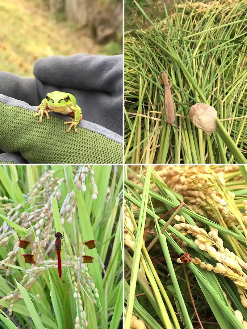 稲刈りはすべて手刈りで行なっているのですが、田んぼで出会うかわいい生きものたちとの出会いも楽しみのひとつです。稲刈りが終わると、カエルたちは穴をほって巣ごもりし、たくさんのヤゴが泥の中に眠り、人のいなくなった田んぼは鳥たちの格好のえさ場にもなります。また来年、と祈りつつ、共に生きる喜びを感じる農作業です。