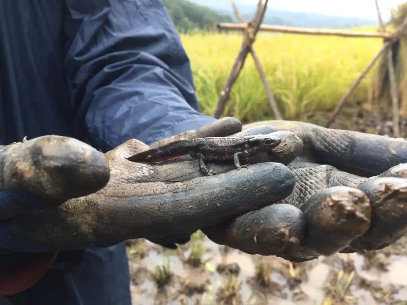 日本イモリ。踏んで傷つけてしまわないように安全な場所に移動させます。
