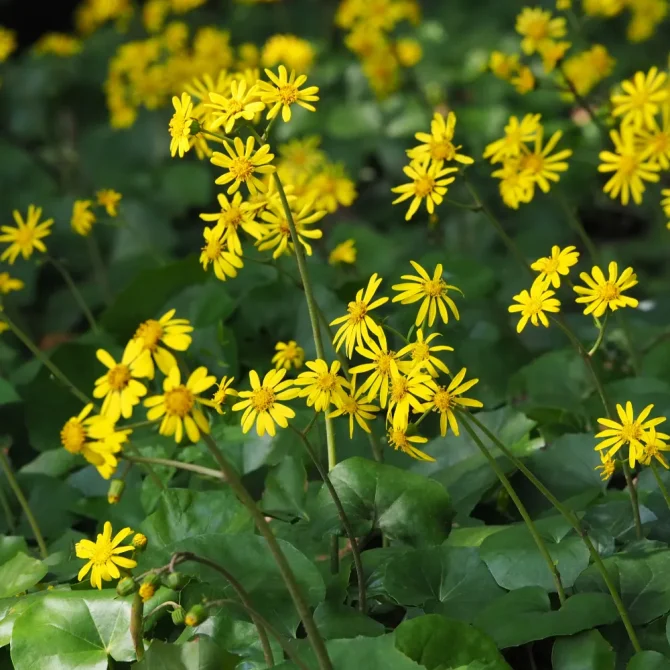 裸木も目立ちはじめ、草の花がめっきり少なくなるこの季節、健気に咲いているのがツワブキの花。海辺の山に多い草ですが、内陸の山庭に植えても、元気な明るい黄色の花を咲かせてくれます。