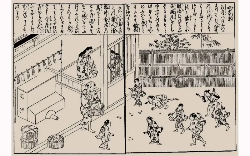 蜜柑まきは明治の終わりごろに廃れてしまったようですが、昭和初期の石工一家を描いた向田邦子原案のドラマ『響子』には、この風習をまだ守っている様子が詳しく描かれています。神棚に全員で柏手を打ってから、うやうやしく蜜柑の木箱を開け、奇数の数にわけて仕事先や近所の人に配りにいきます。ふいご祭の行事が終わらないと蜜柑を口にすることはできなかった、と主人公は述懐します。