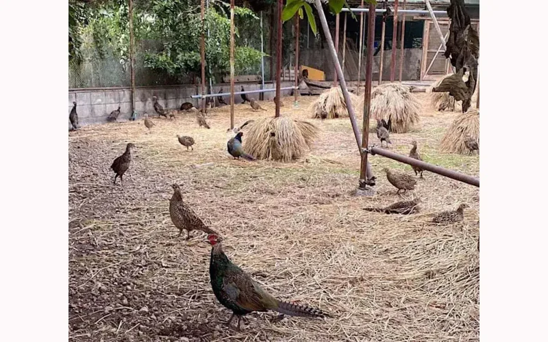 縄張り意識の強いキジを集団で飼うのはなかなか大変なようで、間近でみるとキジは眼光するどく、いかにも闘争心が強そうです。一方、メスは「焼野の雉」ともいわれ、火のついた野原でも逃げず、焼け死んでも雛を守ろうとするとされ、母性愛の強さで知られています。