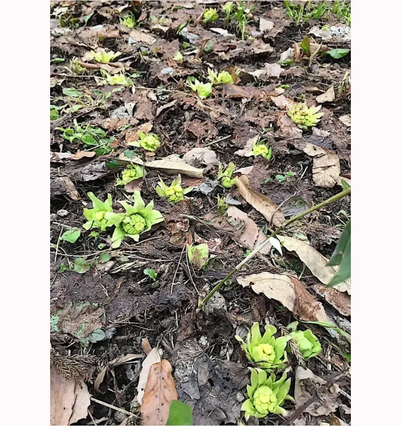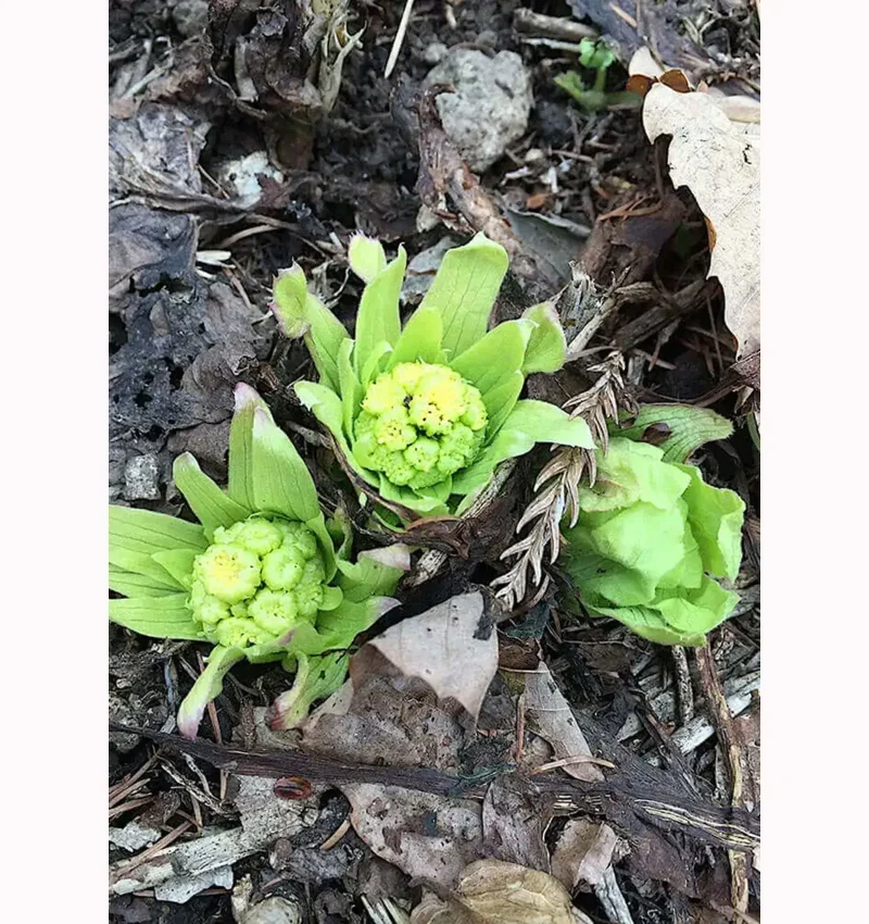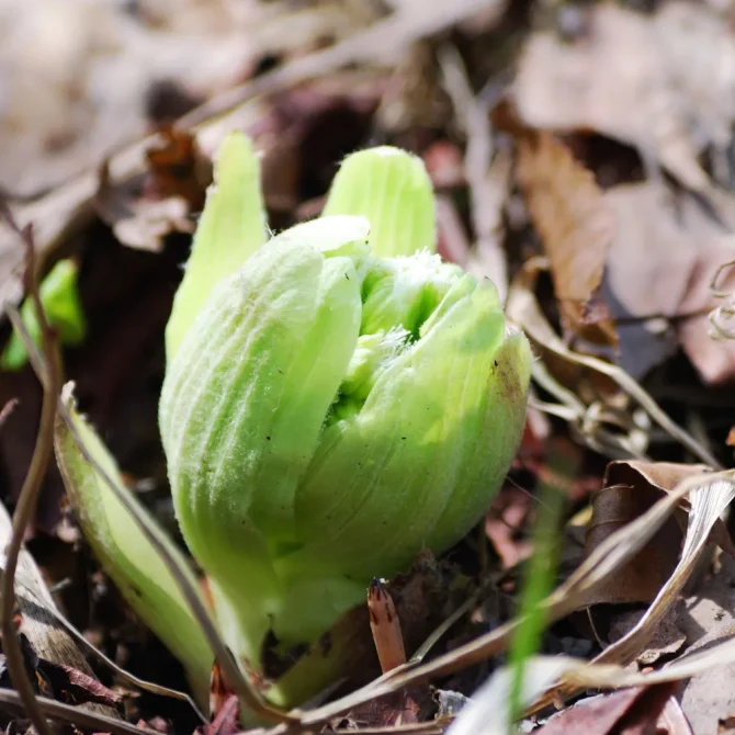 七十二候では「はなさく」と読ませていますが、花が咲くのはもう少し先。今、見られるのはつぼみたち。フキの花蕾は防寒のため、白い綿毛のついた苞で幾重にもしっかり包まれています。それが次第に放射状に開いてくると、薄緑色の花のように見えます。ですので「咲いている」というよりも「ひらいている」と感じていただくと、わかりやすいかとおもいます。