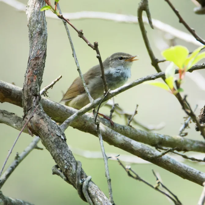 ほんのわずかな「ぐぜり」でも、鈴がころがったかのような澄んだ音色は別格。朝の小鳥たちがにぎやかになる時間。他の小鳥たちのさえずりに混じって、ほんのわずか鳴いたと思うと、すぐどこかに行ってしまいます。
