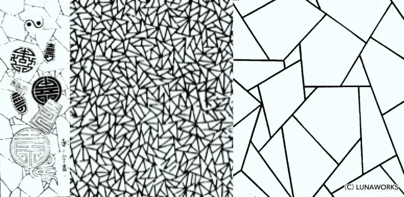 氷割れ(ひわれ)文様は着物の地模様に使われることが多く、建具、工芸、包み紙など、かつてはかなり頻繁に使われていた幾何学文様で、骨董の陶磁器ででは氷裂文(ひれつもん)として知られています。
