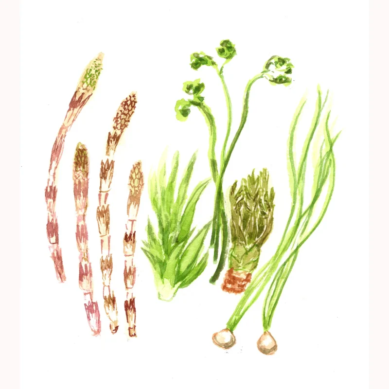 絵に描いたのは、左から土筆、萱草、蕨、楤の芽、そして野蒜。どれも小さくて柔らかで、そっとそっと扱わないと潰れてしまうほどフラジャイル。優しく手で摘んで籠に入れます。一人分だから、ほんの少しで十分です。摘んだらすぐに家に戻ります。
