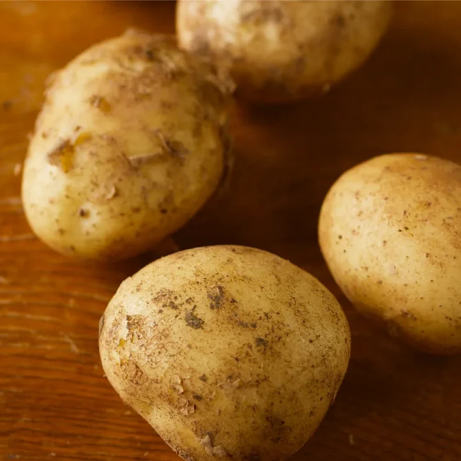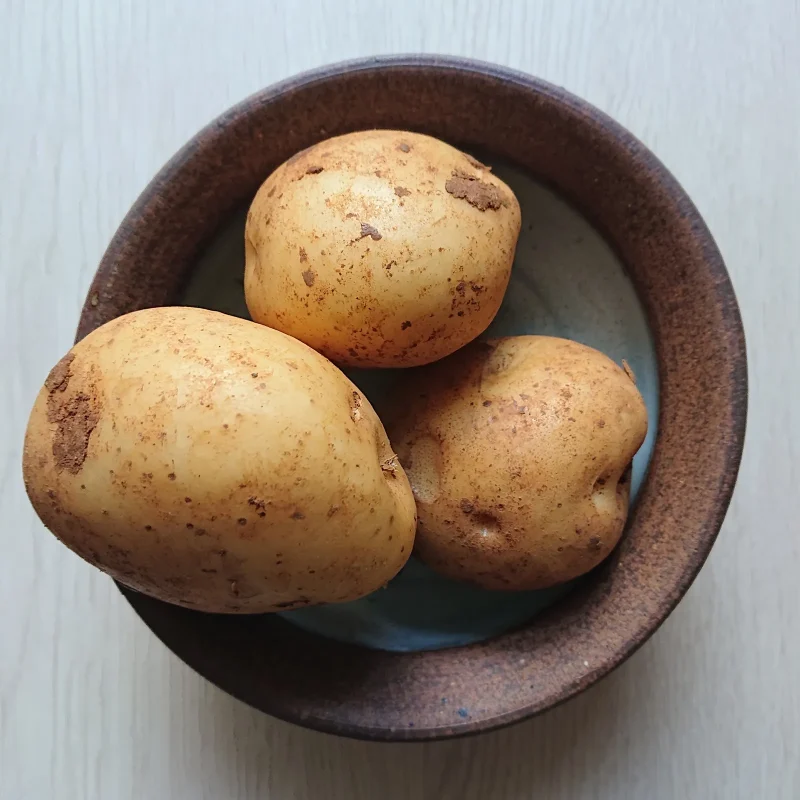 食感はホクホクというよりシットリしています。指でもめくれるほどの薄い皮なので、皮付きで調理して風味を活かします。煮っころがし、じゃがバターなど濃い目の味付けが、みずみずしく爽やかな香りをもつ新じゃがいもの良さを押し上げてくれます。皮付きフライドポテトは間違いないですね!