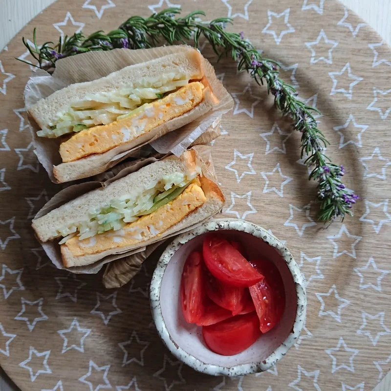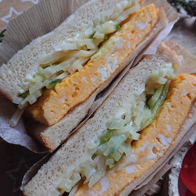 ④パンにうすくスライスしたバター、卵焼き、③を挟んで完成です。