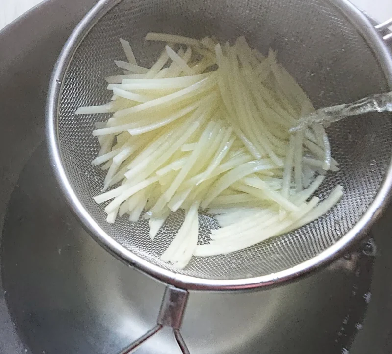 ①よく洗った新じゃがいもの皮を剥いて細めの千切りにします。