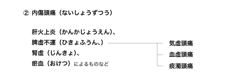 頭痛は、大きく外からの影響による①「外感頭痛(がいかんずつう)」と体の内からおこる②「内傷頭痛(ないしょうずつう)」に分けられます。