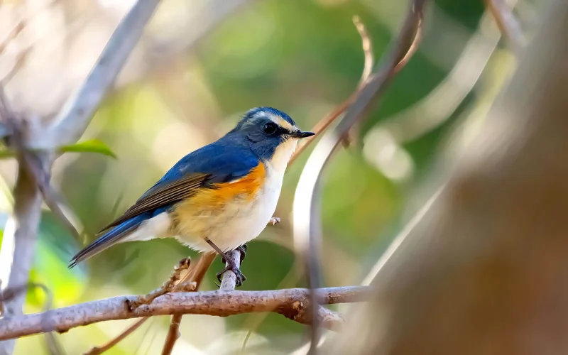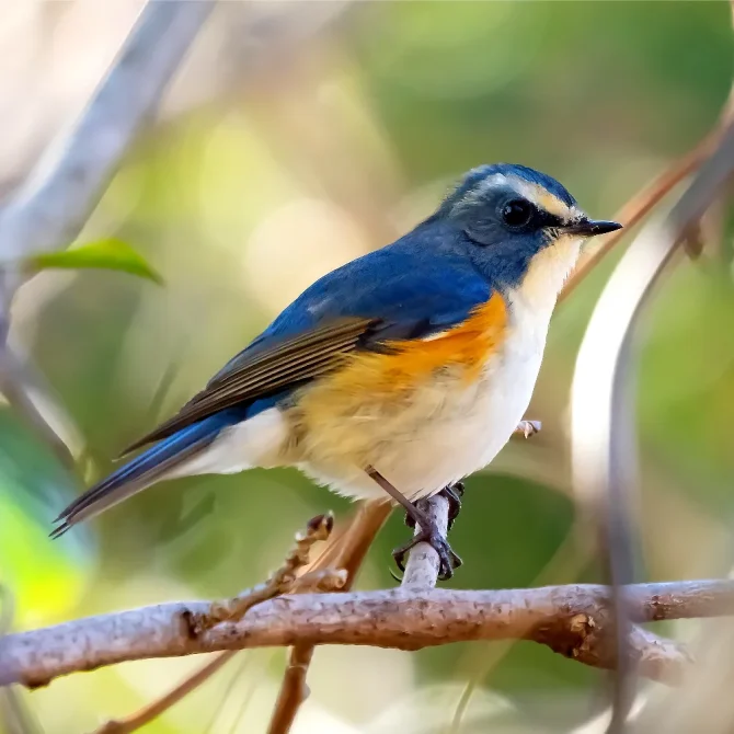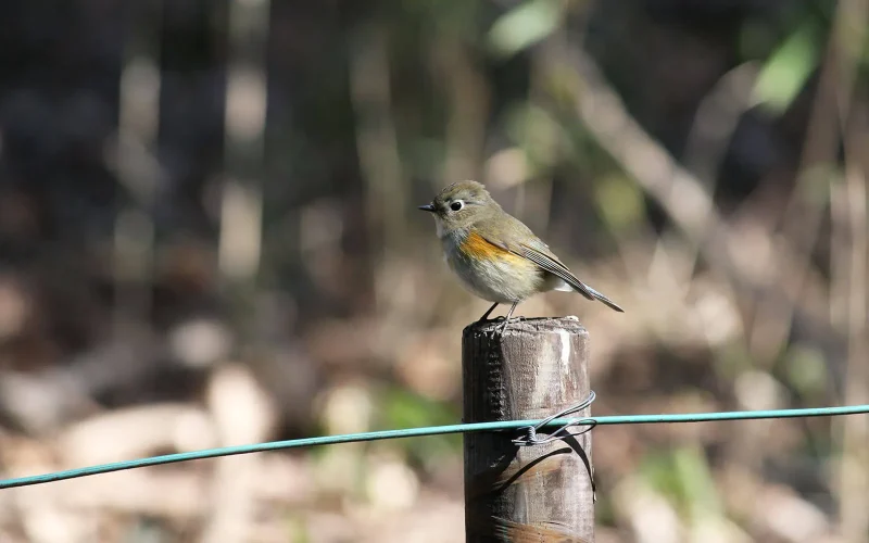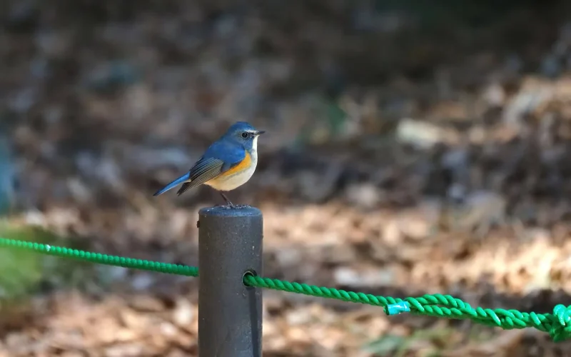 オスは脇腹がオレンジ色で、体上面は目の覚めるような美しい青色をしています。メスは全体が明るい褐色ですが、オスと同じように脇腹がオレンジ色。雌雄どちらもヒタキ科特有のくりっとした目がかわいい小鳥です。