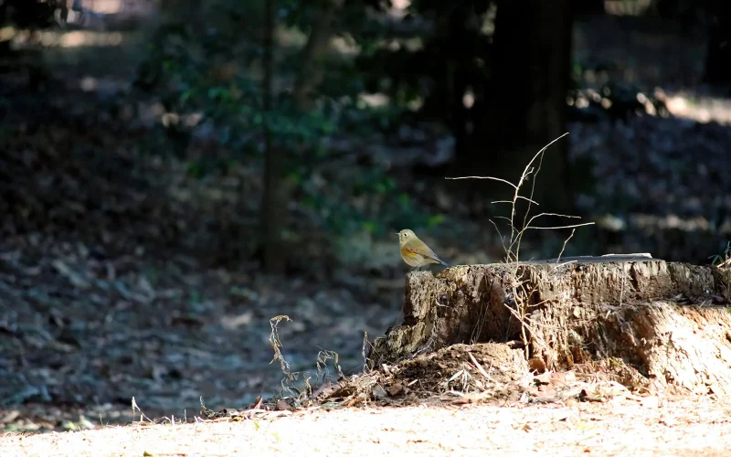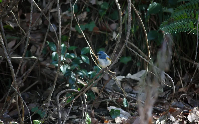 ルリビタキに会うには、「ヒッヒッヒッ」の声がたよりです。林の中をゆっくりと歩きながら声を探します。そして、声が聞こえたら立ち止まってその方向に注目。きっと低い枝と地面を行ったり来たりするルリビタキの姿が見つかるでしょう。