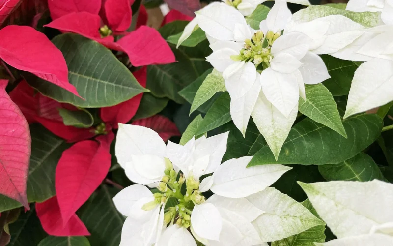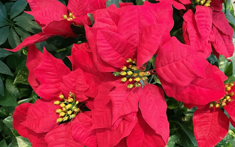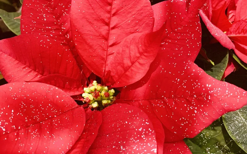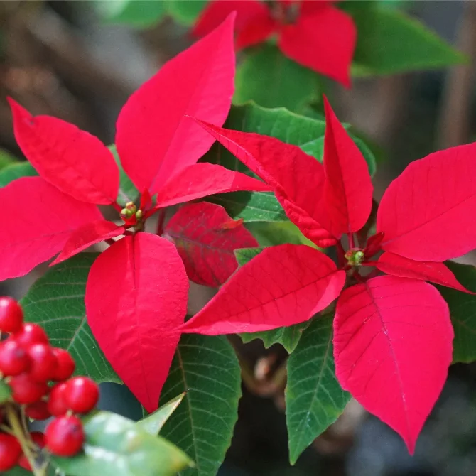 花期は12~2月。花を保護する苞葉が、クリスマスカラーの赤に染まるので、クリスマスフラワー、ウインターローズという別名も。