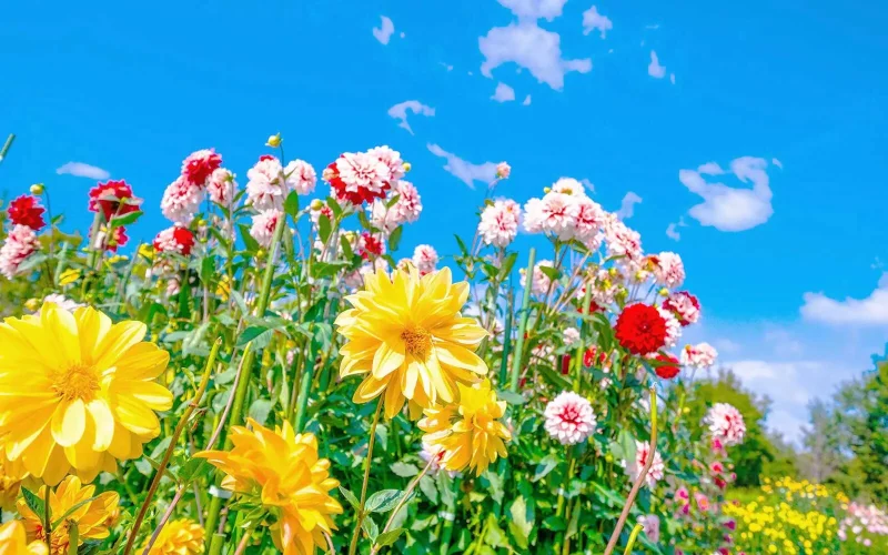 花の色は白、ピンク、オレンジ、赤、黄、紫、青の7色。花の咲き方は一重、八重、ポンポン咲き、カクタス咲きなど10数種類もあり、花の大きさは径3㎝以下~30㎝以上までの6段階、草丈も50㎝~150㎝以上の6段階に分けられます。