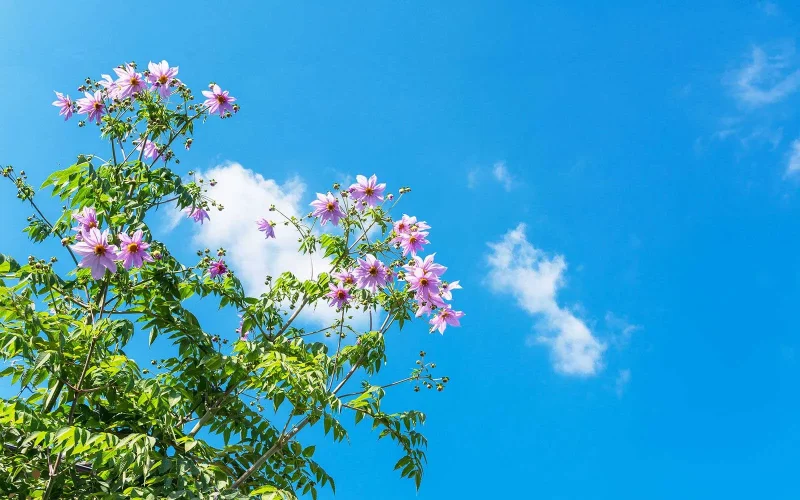 皇帝ダリアの花言葉は「乙女の真心」と「乙女の純潔」。皇帝ダリアは野生種に近く、花色もピンクほか紫・白で、ほとんどが一重咲きのまま。国や時代を越え、花姿を大きく変えて愛され続けたダリアですが、寒さに向かう季節に、空の青を透かして気高く花を開く皇帝ダリアには、ひときわ励まされる思いです。