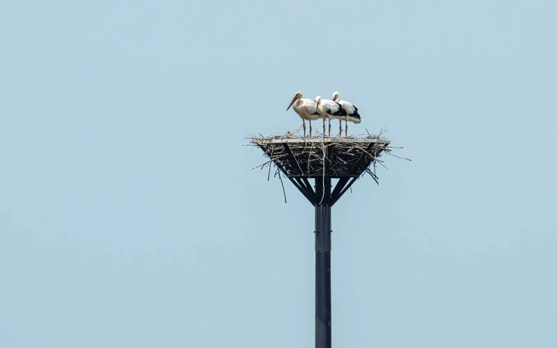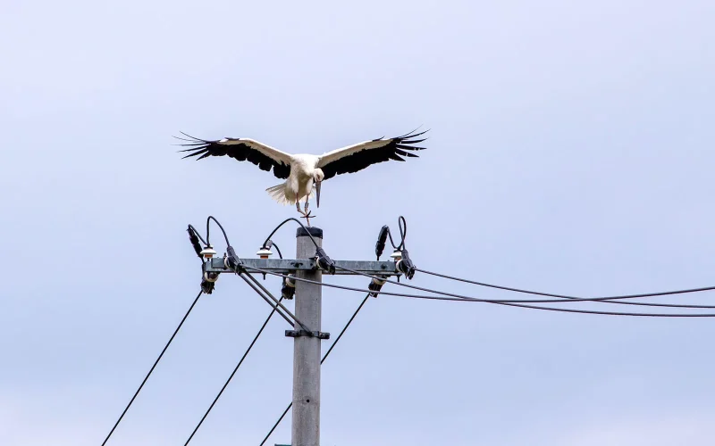 コウノトリは、背丈が約110cm、翼を広げると約2m20cmもある巨大な鳥です。くちばしと脚が長くツルに似ていますが、ツルとはかなり縁遠い関係で、けっこう違いがあります。例えば鳴き声です。「鶴の一声」という言葉があるように、ツルはラッパのような大きな声で鳴きます。しかし、コウノトリはほとんど声を出しません。そのかわりに、くちばしを打ち鳴らして音を出す「クラッタリング」と呼ばれる方法でコミュニケーションをとるのです。他にも、木の上や電柱のてっぺんにとまるなど、ツルには見られない習性があります。