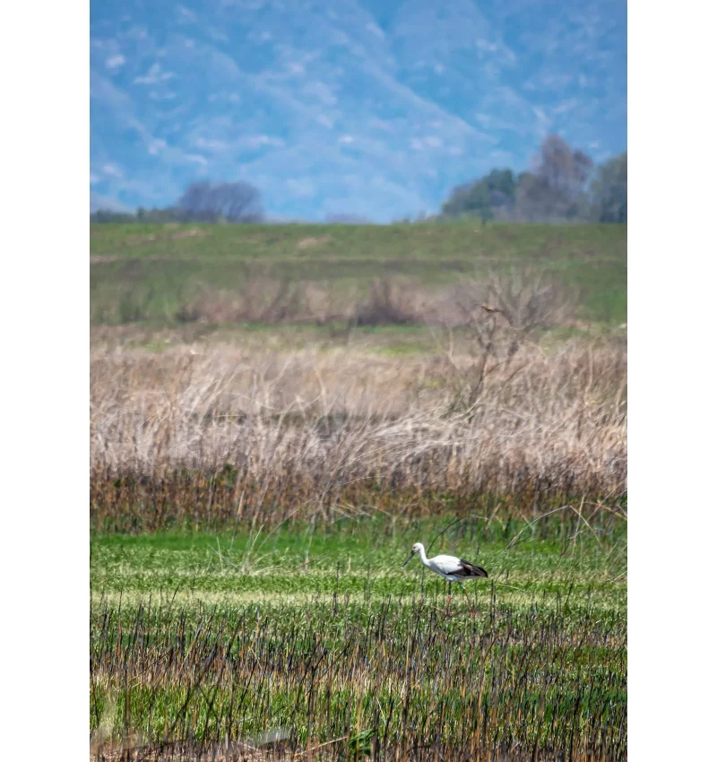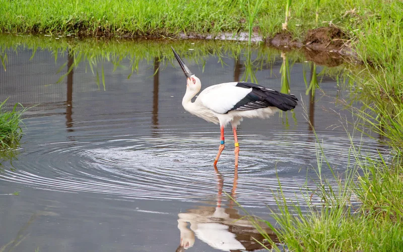 水鳥のコウノトリは、川や湖沼などの湿地帯がすみかです。また、人工的な湿地でもある水田を多く利用し、今では水田にいることが多いかもしれません。主な食べものは、湿地にすむ魚やカエル、ザリガニ、バッタなどの昆虫、ヘビなどで、本当にいろいろな生きものを捕食します。あの巨大なくちばしにもかかわらず、小さな獲物も捕らえることができ、意外と器用な一面があるんだなと思います。