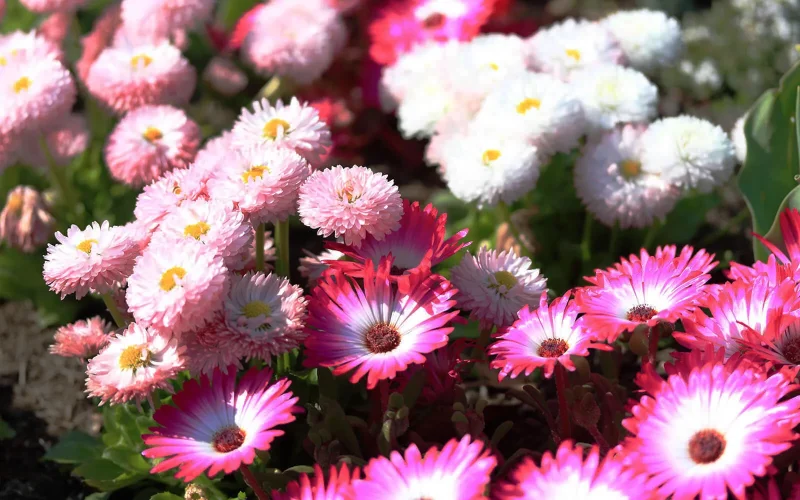 春の光が柔らかく降る中で、花壇では赤や白、ピンクなど、カラフルで可憐な花が群れ咲いています。小さく可愛らしい花がキクに似ていることから和名はヒナギク(雛菊)。ヨーロッパではなじみの深い草花で、日本でも英名のDaisy(デイジー)で呼ばれることが多くなりました。