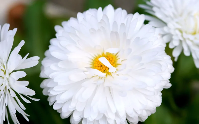 キク科ヒナギク属の多年草でヨーロッパ原産。草丈10~20㎝。3~5月、高さ約10cmほどの花茎を伸ばし、先端に径約2cmの頭状花を一輪ずつ咲かせる。花色は基本の白のほか、淡紅や濃紫、絞りなど多彩。中央の筒状花は黄色で目立つ。園芸品種には八重のものが多い。