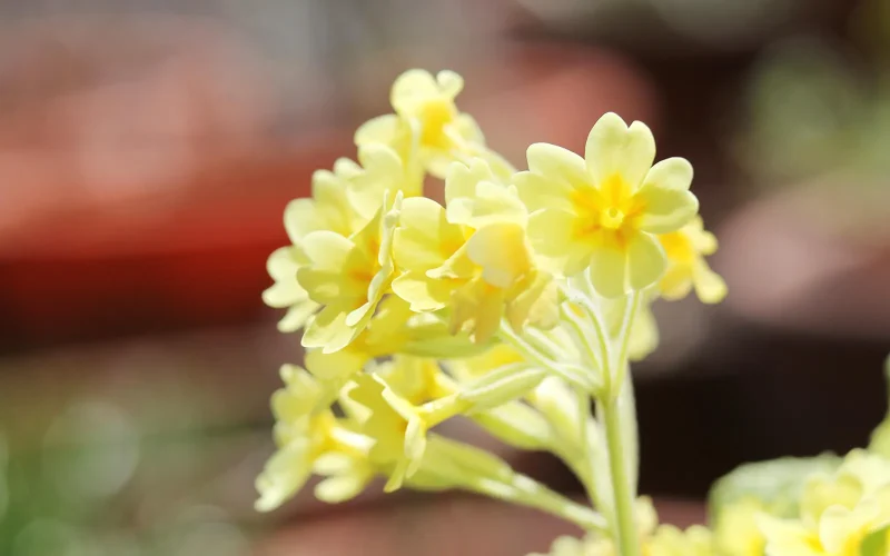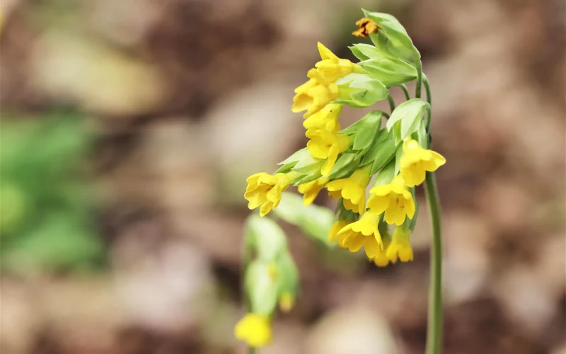 サクラソウ科サクラソウ属の多年草で、ヨーロッパ~西アジア原産。花期は4~6月。伸ばした花茎の頂点に10~30個ほどの細いラッパ型の黄色い小花を、下向きに放射状に咲かせる。甘い香りを放ち、中央部にオレンジ色の斑紋がある。