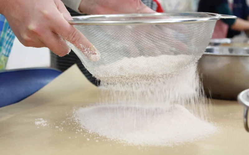 迎えてくれたお店の方は80代の夫婦。おじいちゃんが職人さんで、「まぁ、真似して作ってみなさい。」と一言いうとザザザっと大きな袋から粉をすくい、慣れた手つきで粉を混ぜていきます。