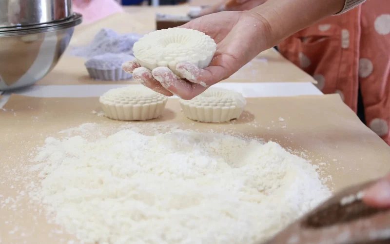 簡単にやってのけるおじいちゃんの真似をしてみてもそう上手くはいきません。米粉と砂糖、水飴が混ざった粉は思っていたよりも重く、木型に入れるのも時間がかかり、押し込むのにもかなりの力が要ります。全体重をのせてグググっと力を押すと「うん、いいね。取り出してごらん。」とおじいちゃん。そばで見守ってくれていたのだな、と嬉しくなりました。